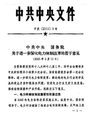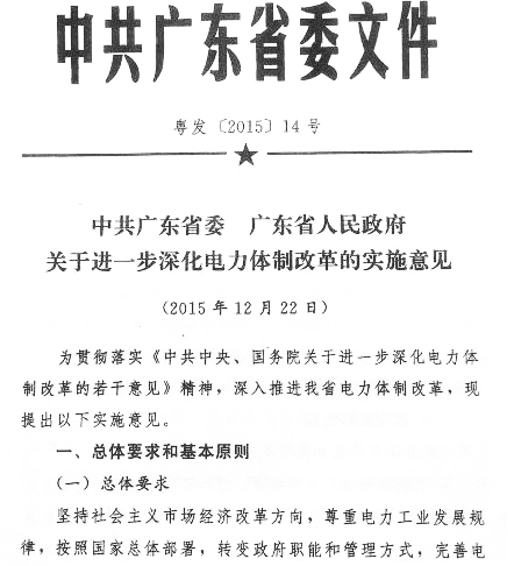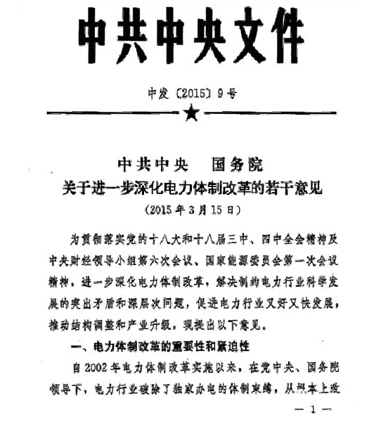 国家为了建立健全电力市场,理顺电力价格形成机制,让市场在资源配置中起决定作用,在2015年3月发布了《中共中央国务院关于进一步深化电力体制改革的若干意见》(中发[2015]9号),启动了新一轮的电力改革。
